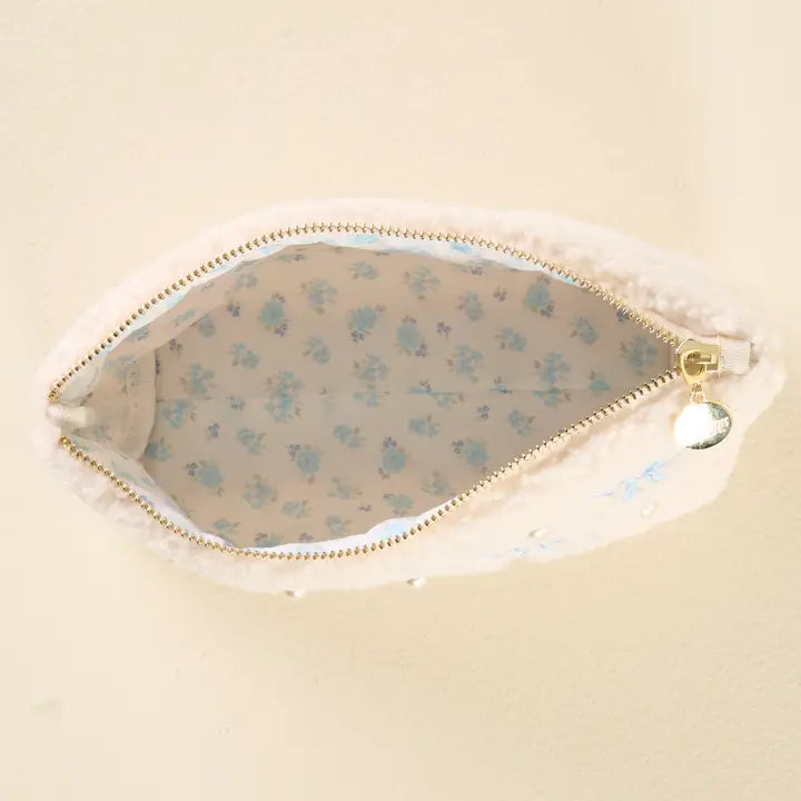 Add a cozy touch to your essentials with our rectangle teddy pouches. Crafted from soft sherpa fabric, these pouches feature a wipeable lining for easy cleaning and gold zippers and hardware for a polished look. The interior is lined with a fun printed fabric, making it as stylish on the inside as it is on the outside. The large rectangle size is perfect for keeping your items organized, and it pairs beautifully with our square or circle options.