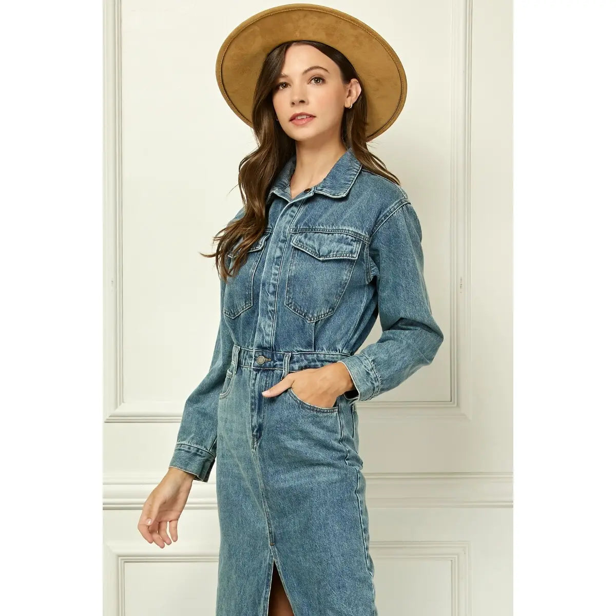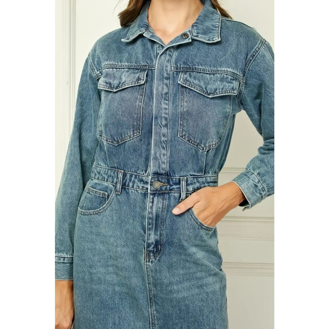 Throw on this washed denim trucker dress and get ready to turn heads. Classic silhouette meets modern ease with a collared neck, chest pockets, and long sleeves finished with button cuffs. Slip your hands into the side pockets (yes, there's a coin pocket too), cinch it at the waist with the belt loops, and button up for an effortlessly cool look. Imported quality that's built to last through countless adventures.
