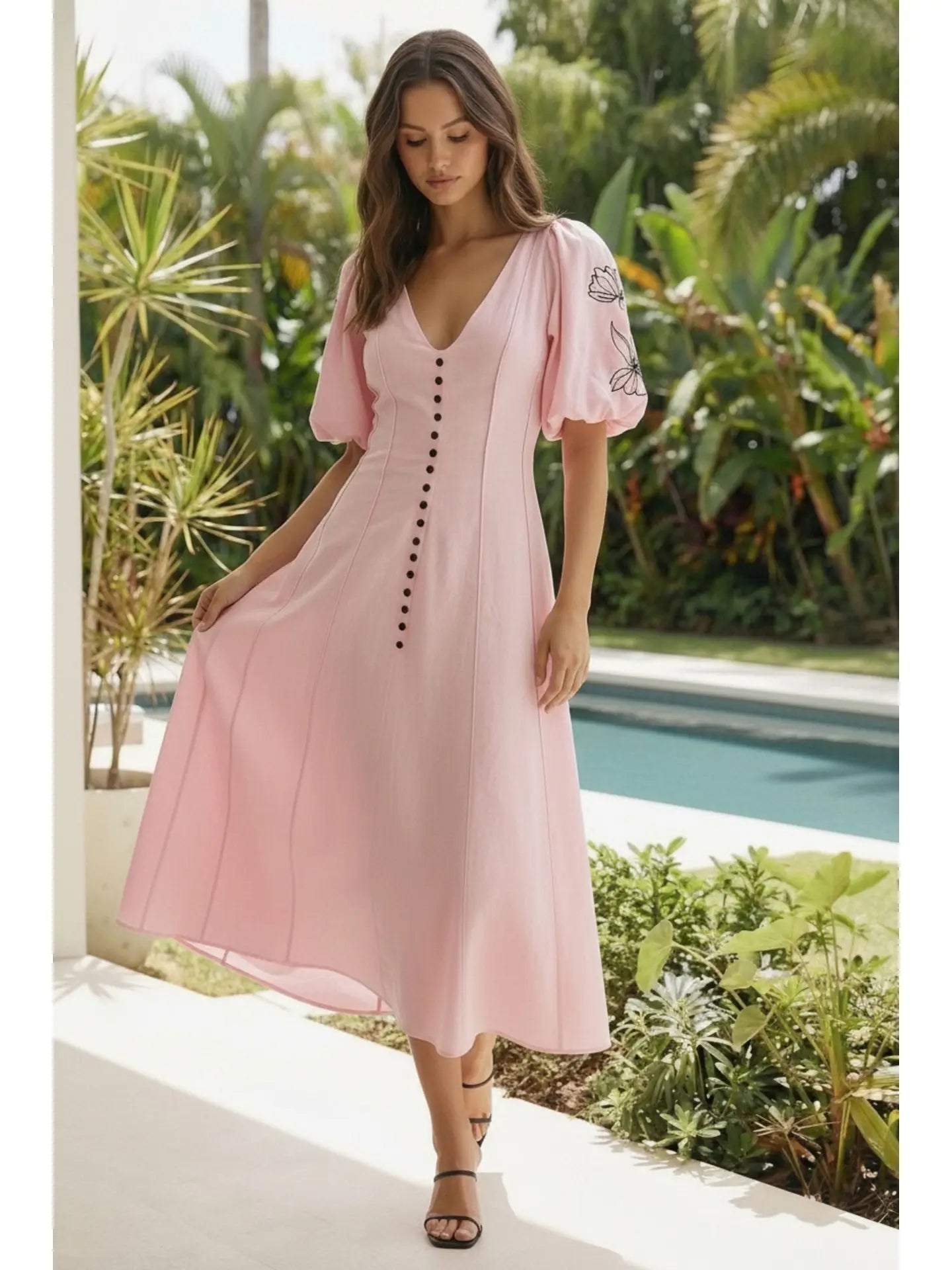 Elevate your wardrobe with this charming embroidered puff sleeve dress. Delicate embroidery adorns the sleeves while a graceful bow detail at the back adds a touch of elegance. The voluminous puff sleeves create a flattering silhouette perfect for any occasion. Whether you're dressing up for a special event or looking for everyday sophistication, this dress combines playful design elements with timeless appeal.