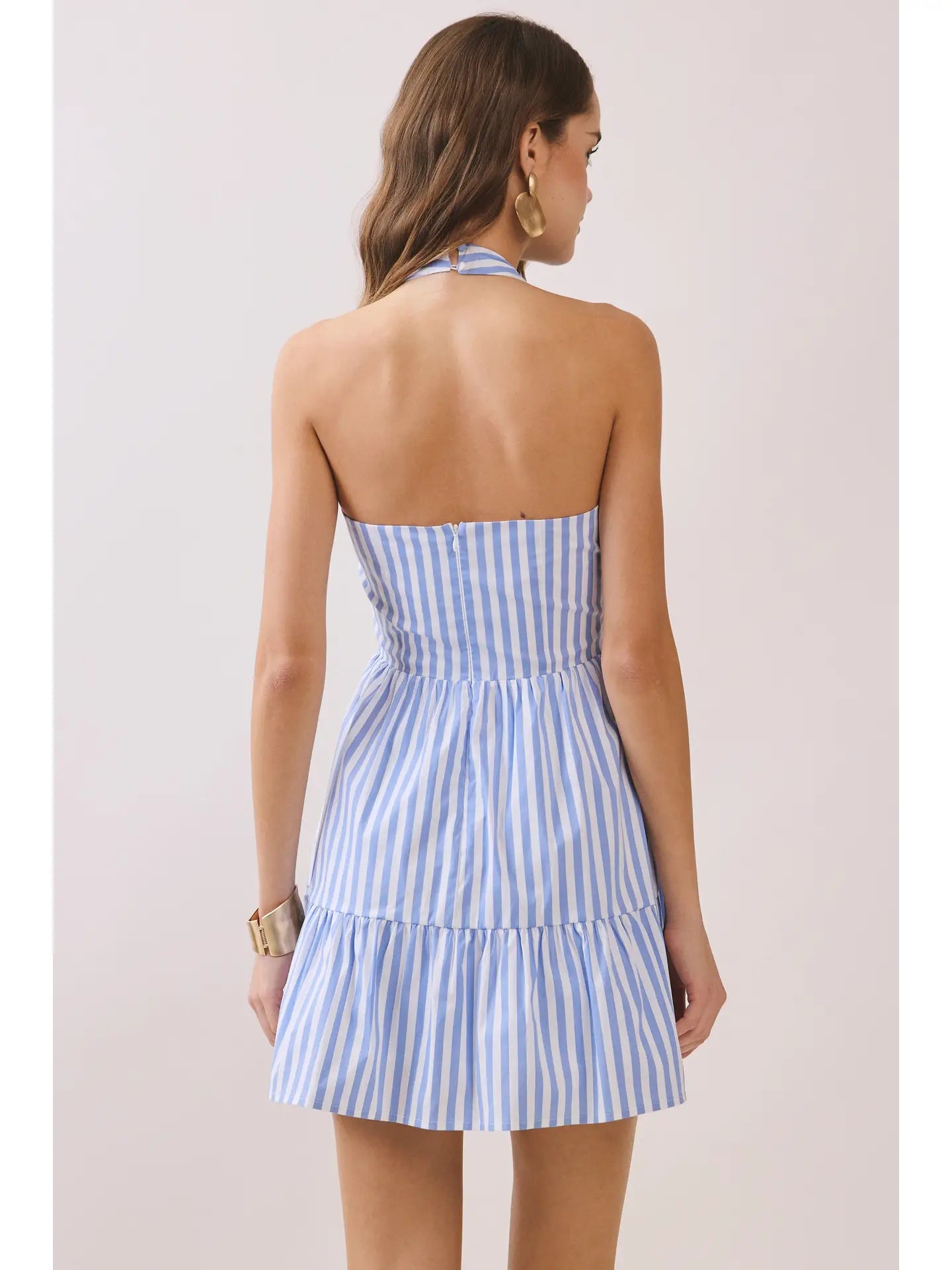 Stripes meet sophistication in this flirty mini dress that's ready for any occasion. The halter neckline and plunging V-neck create an effortlessly chic front, while the fitted bodice hugs your curves just right. A gathered waist seam transitions into a playful tiered skirt that moves with you, and the open back with zipper closure adds an unexpected touch of allure. Perfect for turning heads at brunch, parties, or nights out.