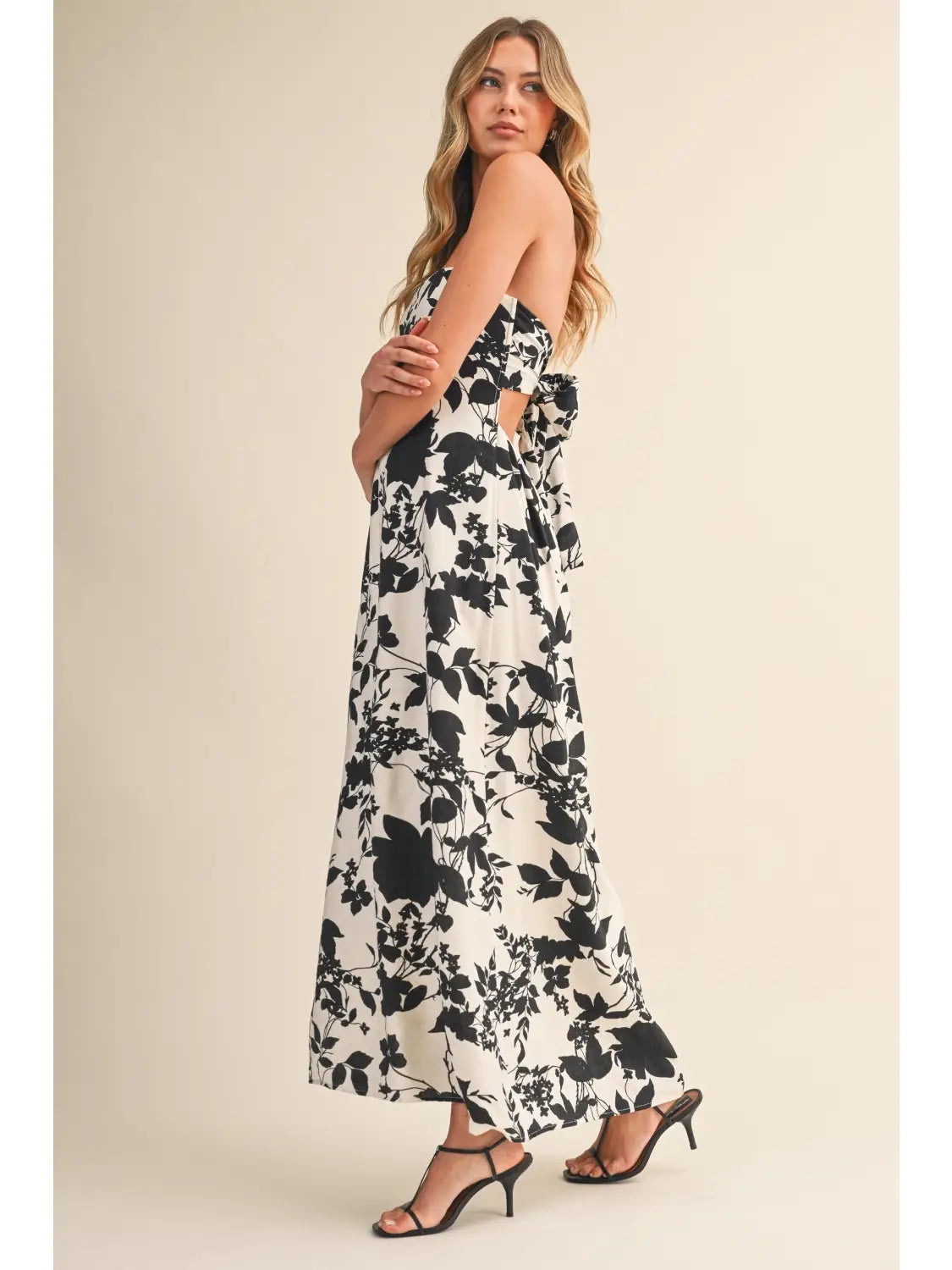 Twirl into elegance with this charming black and white floral maxi dress. The delicate floral print brings a fresh, romantic vibe, while the back tie detail adds a playful twist that's perfect for showing off your style. Flowing fabric skims gracefully to the floor, making it ideal for everything from garden parties to casual date nights. A dress that's equal parts sweet and sophisticated.