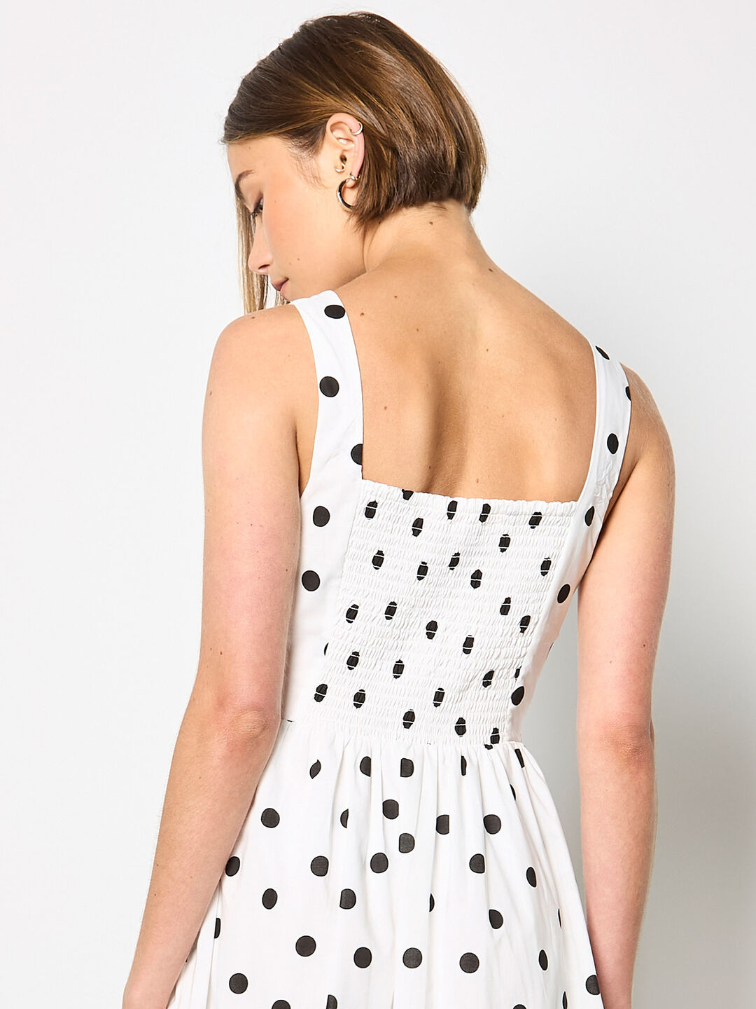 Elevate your occasionwear with this charming polka dot midi dress. Crafted from lightweight woven fabric, it features a flattering A-line silhouette with a square neckline and sleeveless design. The smocked back ensures a comfortable, adjustable fit, while the full lining provides coverage and ease of movement. Perfect for garden parties, weddings, and warm-weather celebrations, pair it with heeled wedges and a clutch for effortless elegance.