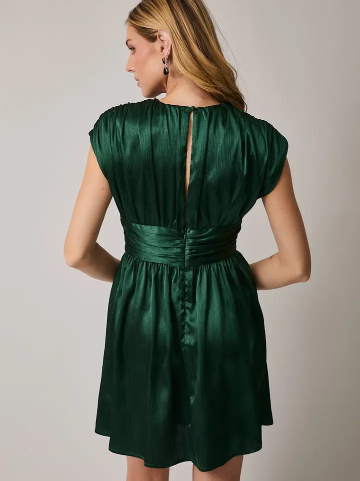Slip into effortless elegance with this show-stopping satin mini dress. The flattering ruched fit-and-flare silhouette hugs in all the right places, while the sleek round neckline and sleeveless cut keep things modern and chic. Rich green hue makes it perfect for holiday parties, festive gatherings, or any occasion calling for a touch of glamour. Luxe satin fabric drapes beautifully and catches the light with every move. Dress it up with heels and statement jewelry, or keep it casual with sneakers for an unexpected twist.