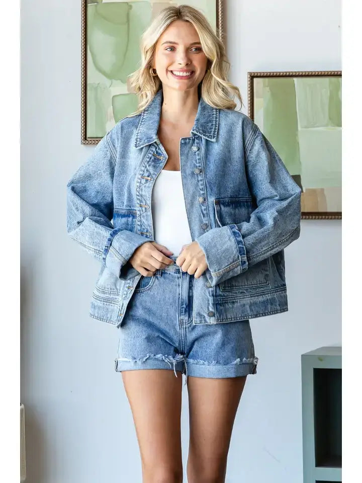 Throw on this imported denim shacket and get ready to turn heads. The oversized front flap pocket is perfect for stashing your essentials (or just looking effortlessly cool), while the classic collar and button closure keep things polished. Long sleeves with finished edges mean you can roll them up or keep them down—whatever mood strikes. Soft, washed denim gives it that lived-in vibe that only gets better with time.