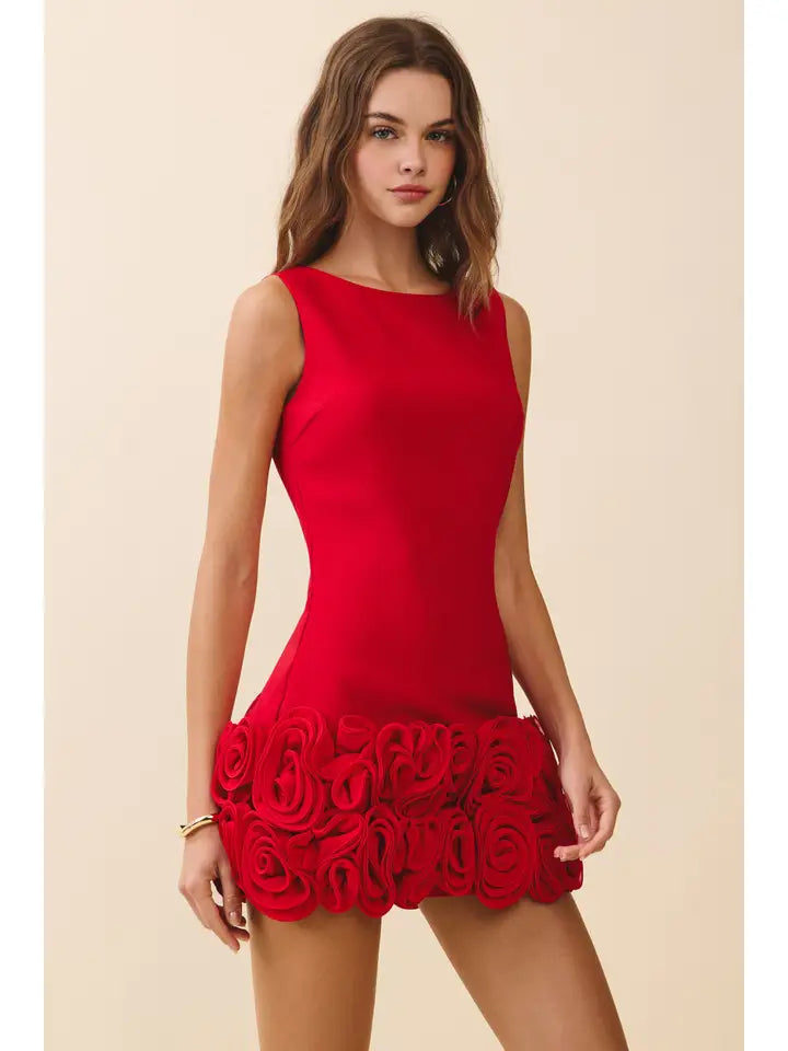 A sleeveless mini dress featuring a fitted bodice that flows into a sculptural rosette hem. The 3D floral applique along the skirt adds dramatic texture, while a concealed back zipper.