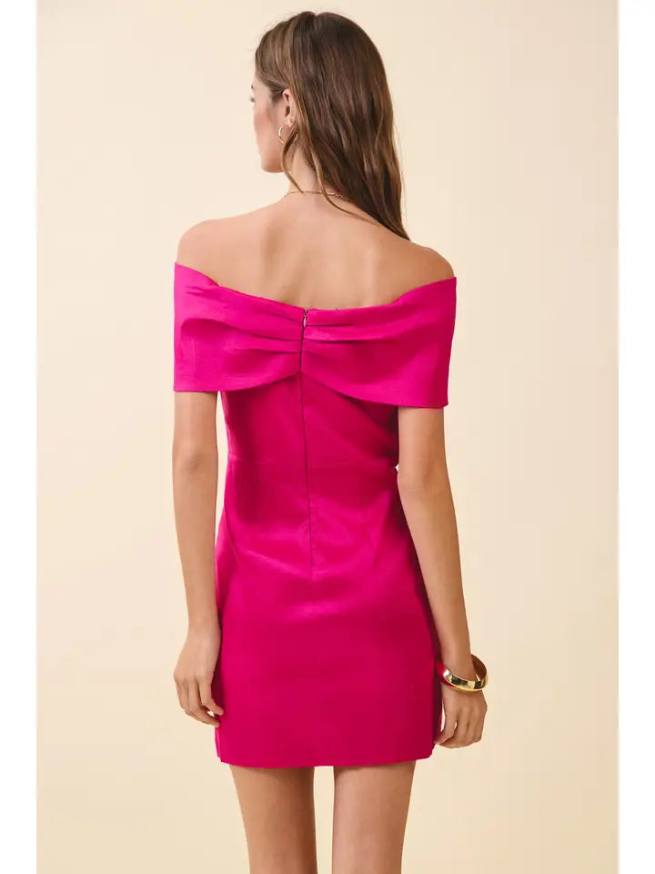 An off-the-shoulder mini dress featuring a statement fold-over neckline with pleated detail. Designed with a fitted silhouette and finished with a concealed back zipper.