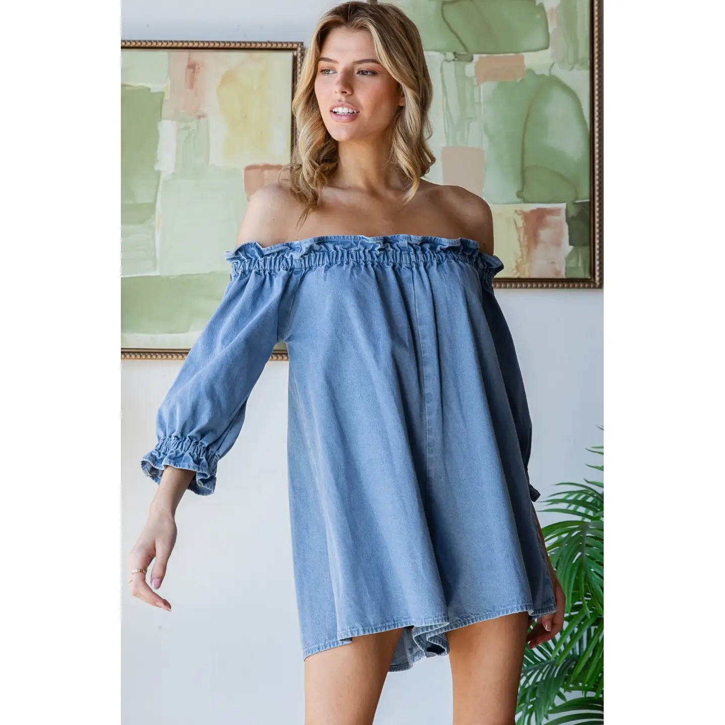 Slip into effortless style with this off-the-shoulder denim romper that's equal parts chic and fun. The mid-length sleeves strike the perfect balance between coverage and flair, while the relaxed silhouette keeps things breezy and comfortable. Whether you're heading to brunch or a casual night out, this playful piece transitions seamlessly from day to night. Pair it with sneakers for a laid-back vibe or dress it up with heels for instant polish.