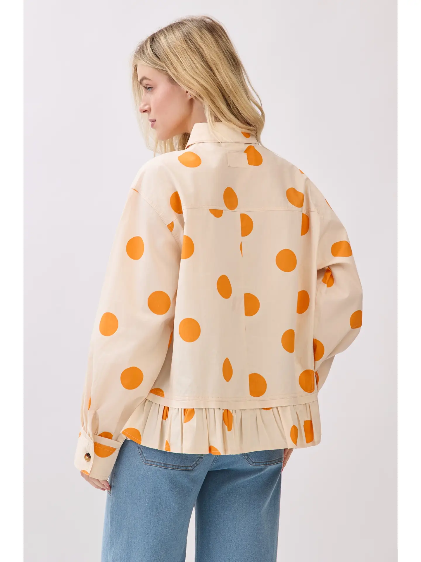 A playful button-down shirt featuring bold black polka dots on a neutral background. Designed with a relaxed fit, single chest pocket, and a flirty ruffle hem for added movement. Perfect for casual days, weekend outings, or layering with your favorite denim.polka dot shirt, ruffle hem top, button down blouse, playful casual top, oversized polka shirt, long sleeve ruffle blouse, weekend casual wear, Sewn and Seen, gameday, game day