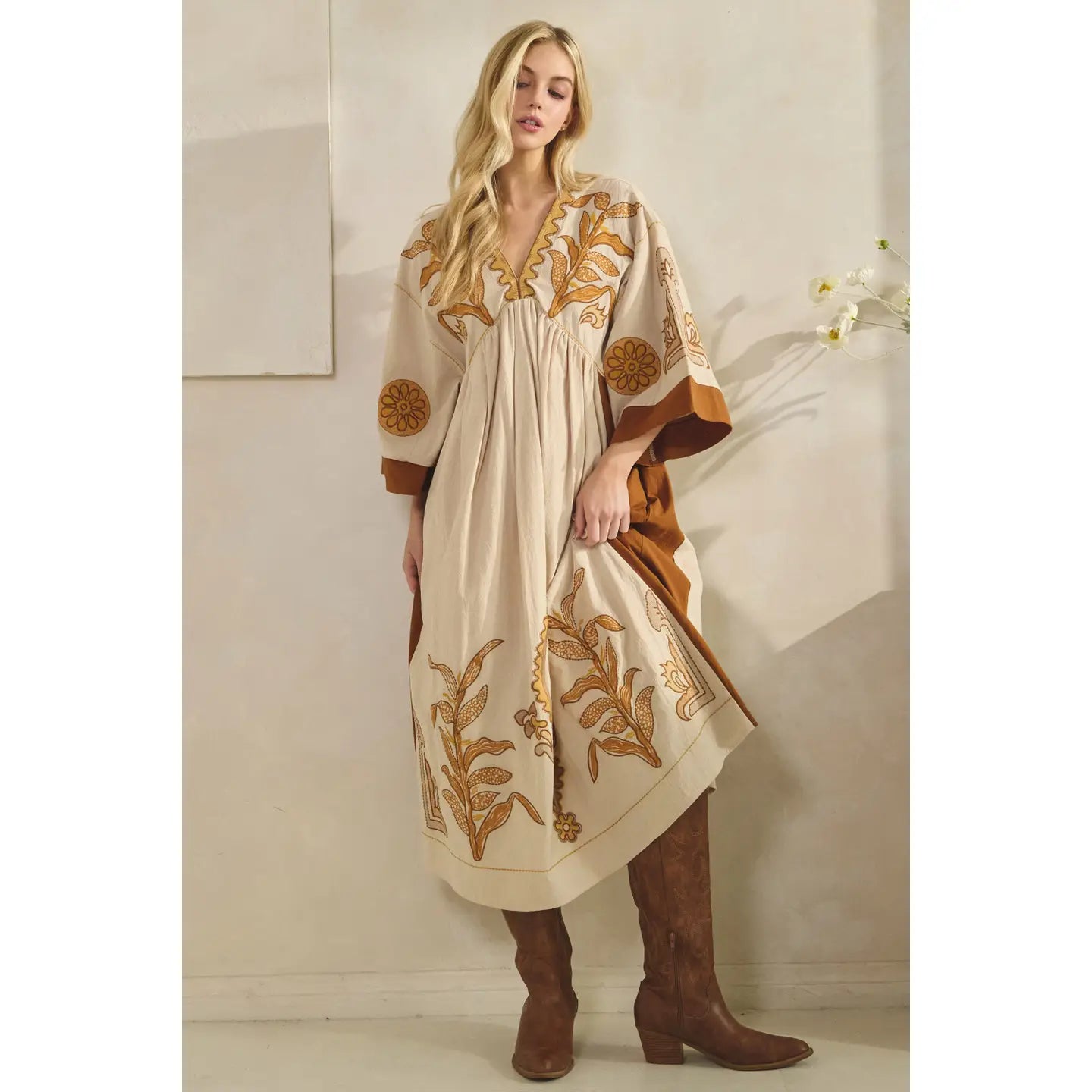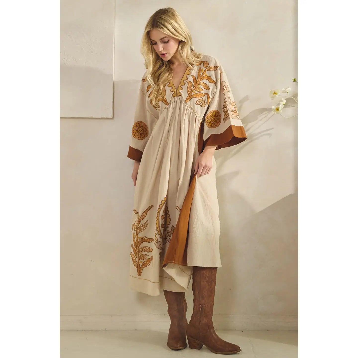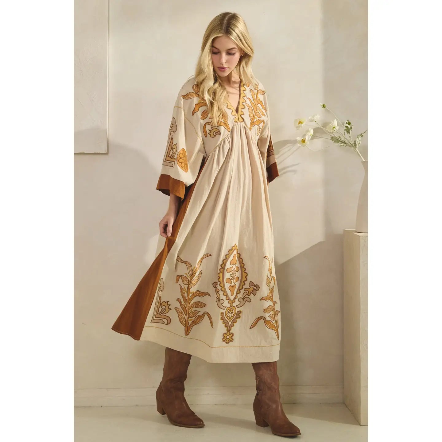 Slip into effortless elegance with this charming maxi dress, featuring a flattering V-neck and relaxed A-line silhouette that moves with you. The standout vintage embroidery patch adds character and storytelling flair, while solid contrast trim along the sleeves and side seams creates visual interest. Imported construction ensures quality craftsmanship from hem to neckline. Perfect for casual outings or dressed-up occasions when you want comfort without compromising style.