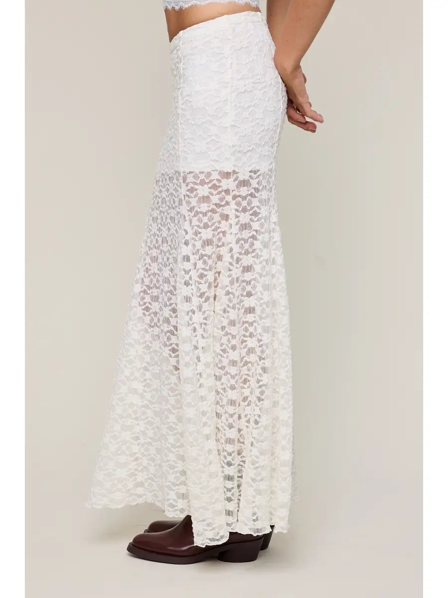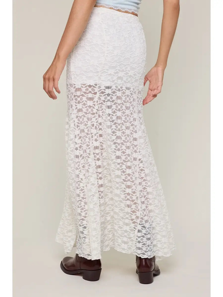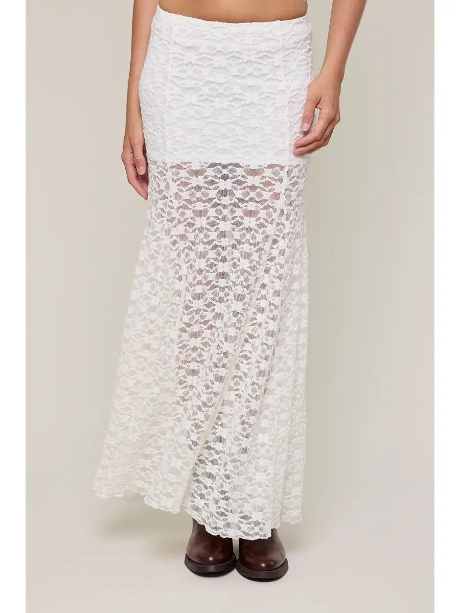 Twirl in effortless elegance with this charming white lace maxi skirt. Sheer and romantic, the delicate lace design creates a dreamy silhouette while the built-in slip keeps you covered and comfortable. Perfect for layering over basics or wearing solo for a flowy, feminine look. Whether you're heading to brunch or a garden party, this versatile piece adds a touch of whimsy to any outfit.