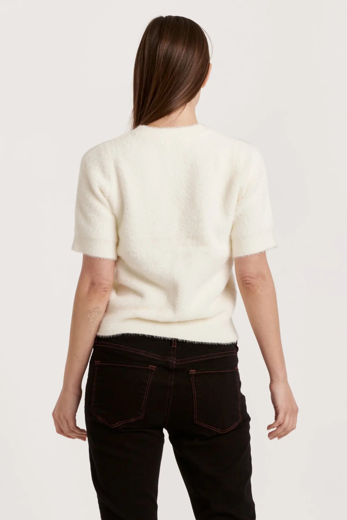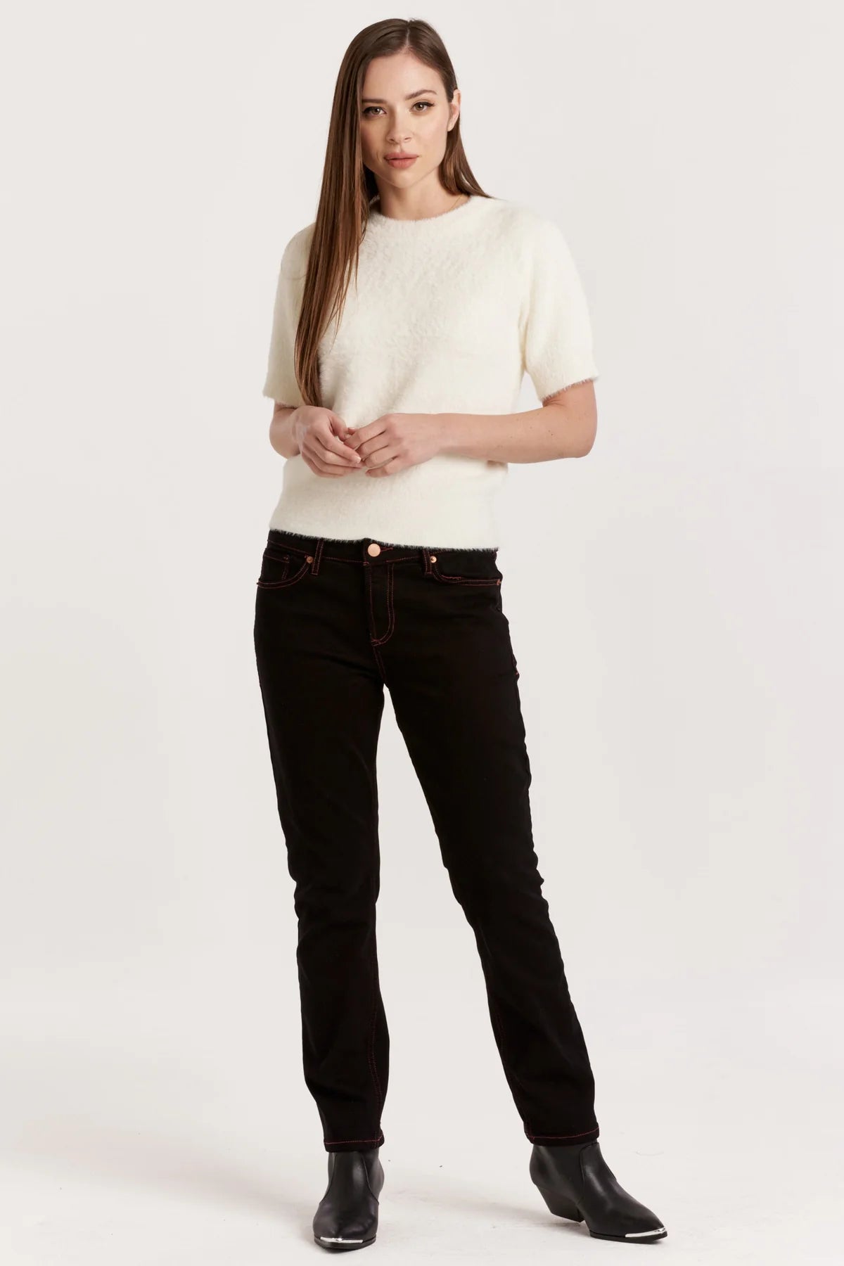 The Susie short sleeve crew neck sweater in a classic black hue, designed for effortless style and unmatched comfort. This versatile piece is perfect for layering or wearing on its own. Its lightweight fabric provides breathability while keeping you cozy. Solid color yarn on standard fit.