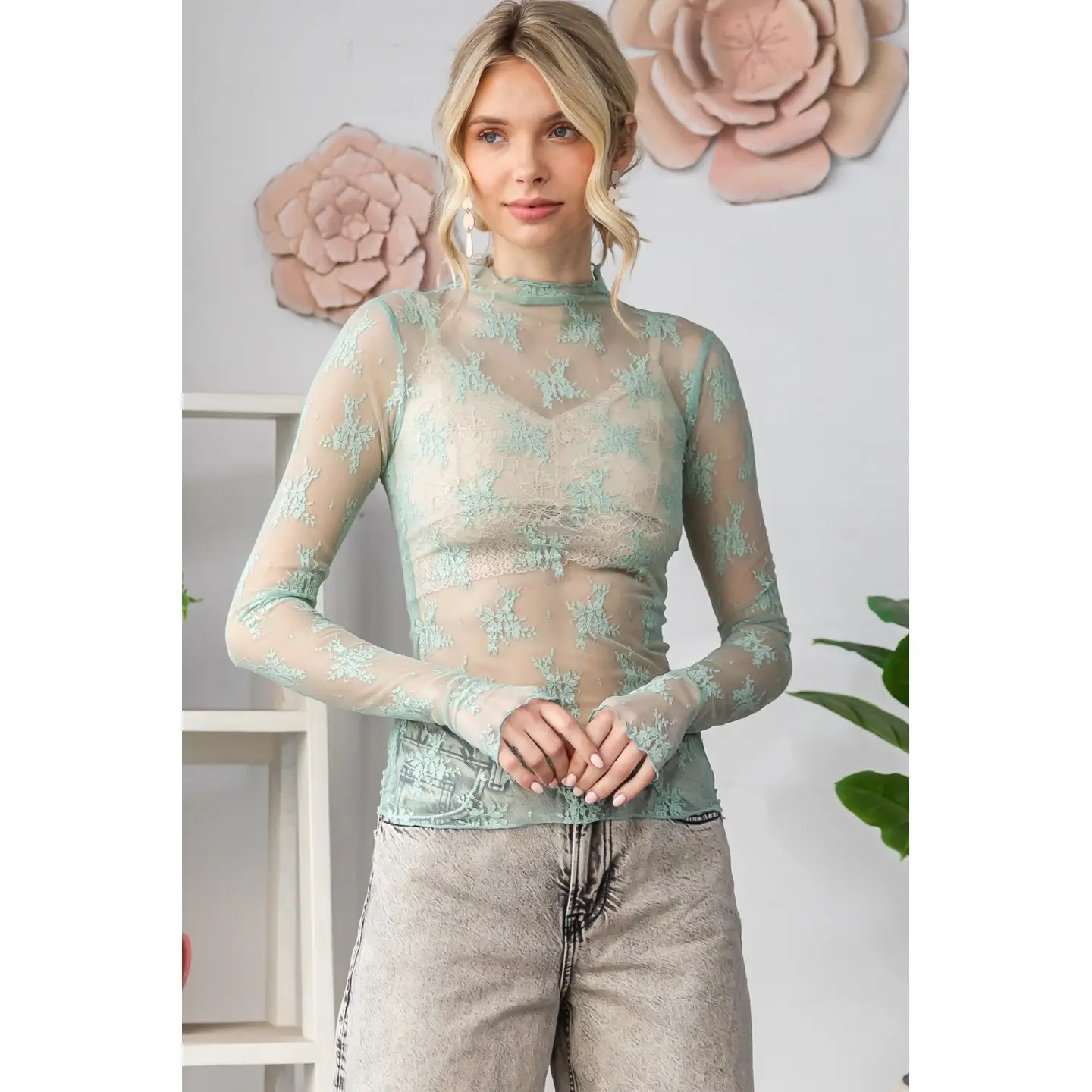 Lace Long Sleeve See Through Top