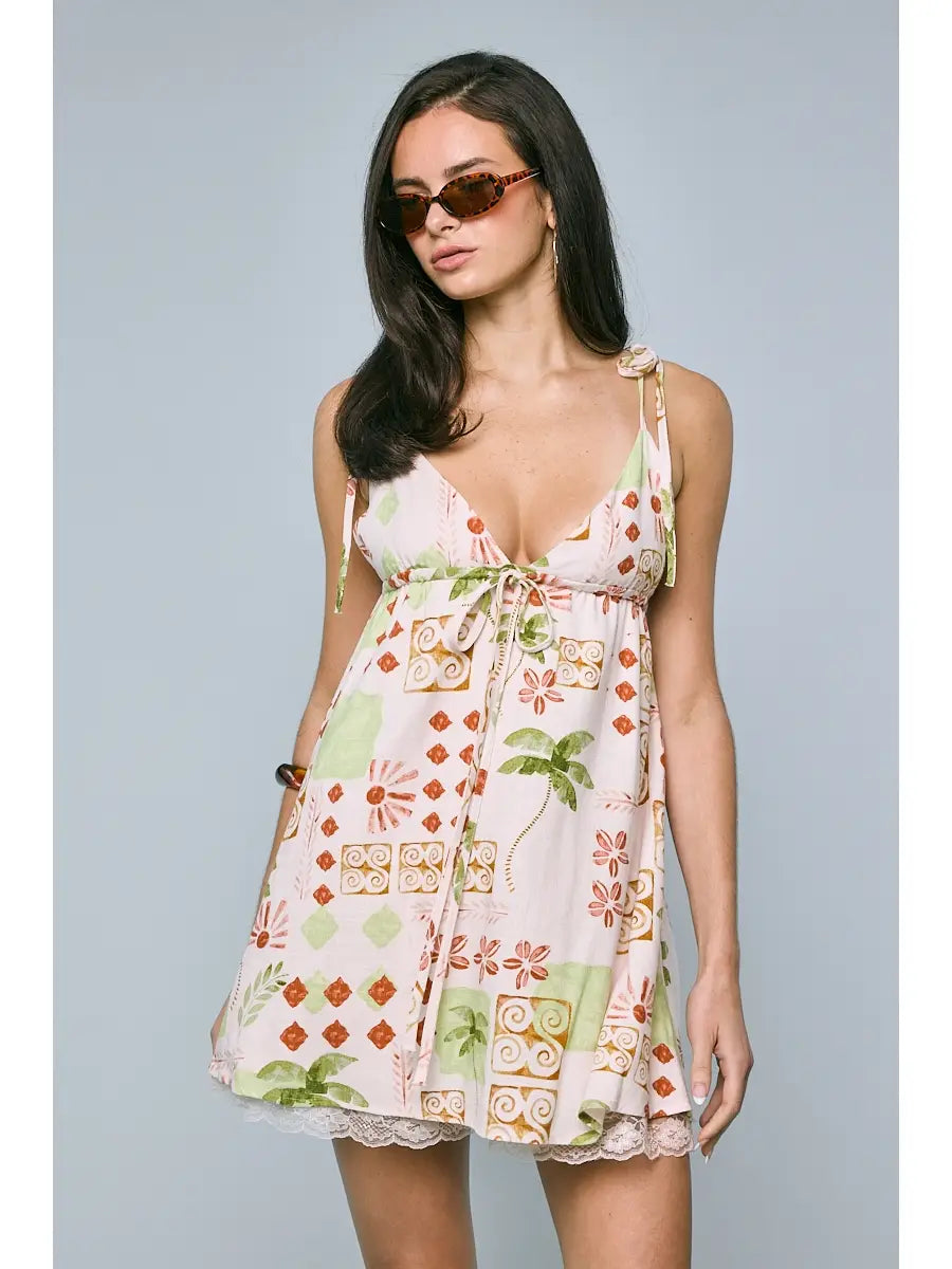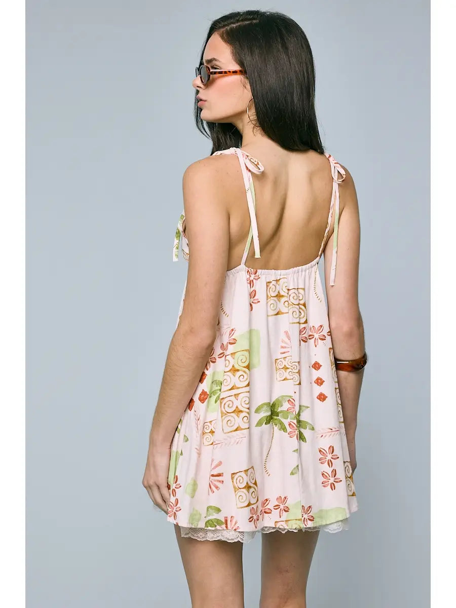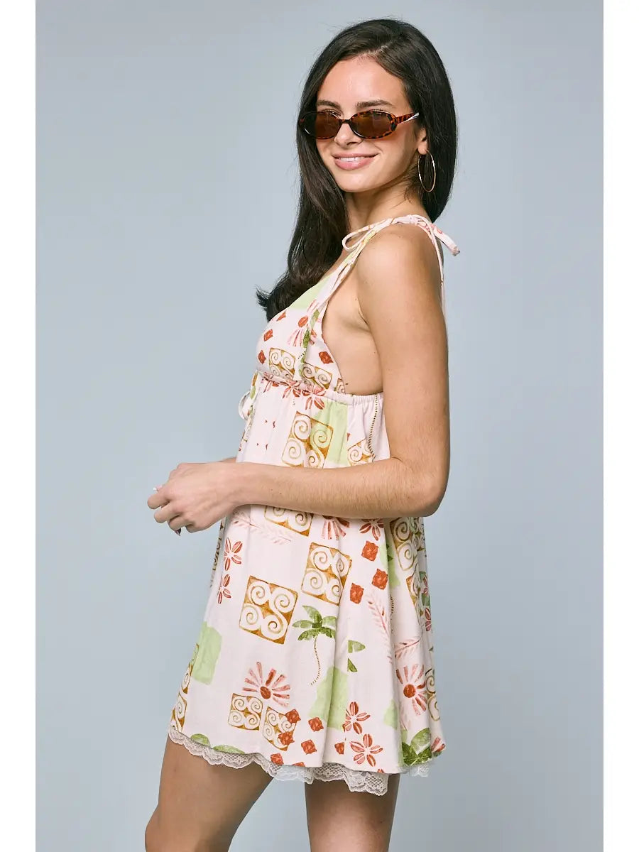 Be a tropical babe with our Palm Tree Strap Mini Dress! Featuring cute palm tree print and delicate lace details on the bottom, this dress is perfect for your next vacation. Get ready to turn heads and soak up the sun in style!