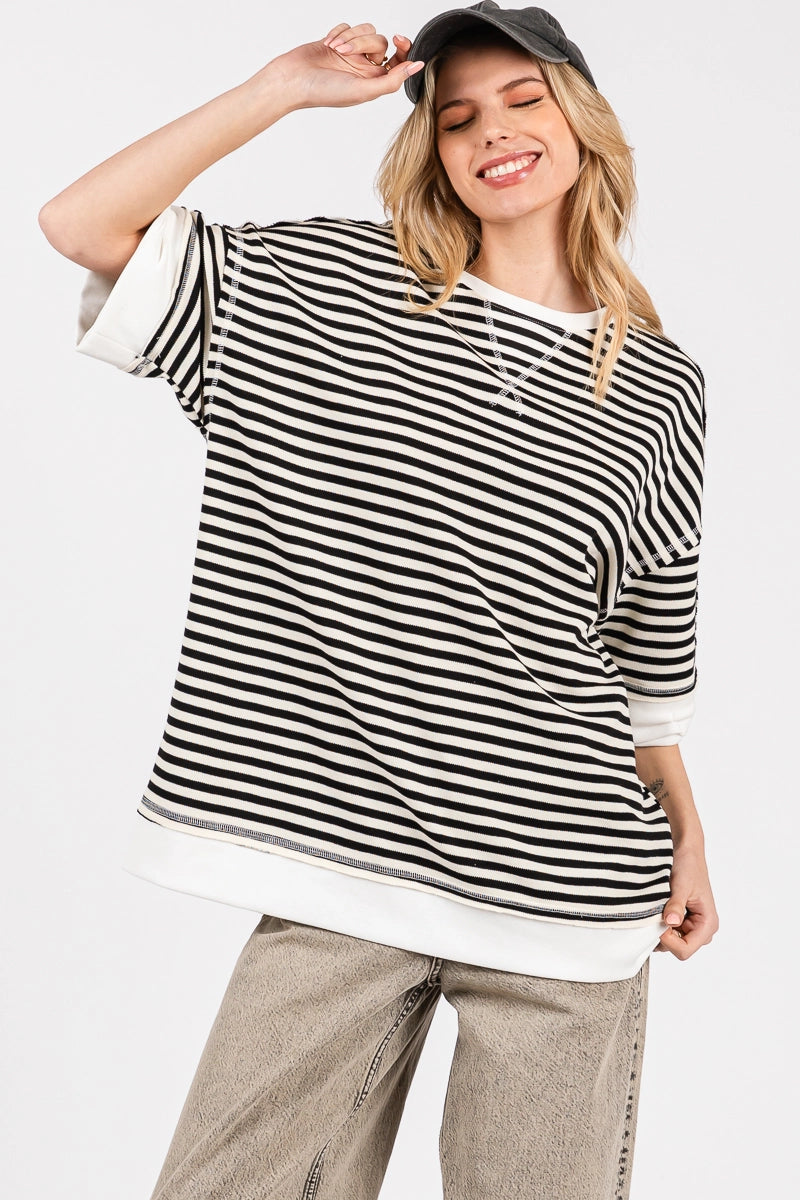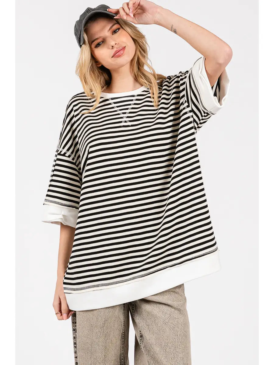 Embrace effortless charm with this striped oversized top, designed for a relaxed, playful vibe. Its roomy fit and bold stripes make it perfect for layering or wearing solo, adding a fun twist to your casual wardrobe. Comfortable and stylish, it’s your go-to for easy, breezy days.
