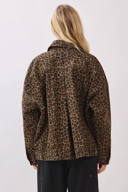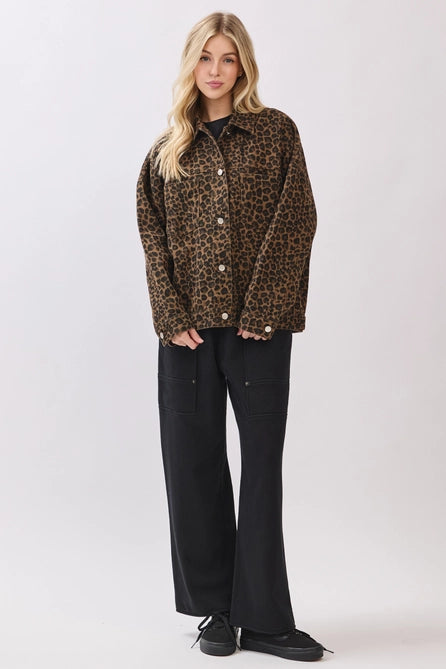 Make a fierce statement with this Twill Leopard Denim Jacket, a bold twist on a classic favorite. Crafted from structured twill denim, this jacket features an all-over leopard print, front snap-button closure, chest flap pockets, and side welt pockets. The slightly cropped fit and relaxed silhouette make it the perfect layering piece for game day, weekend adventures, or a night out!