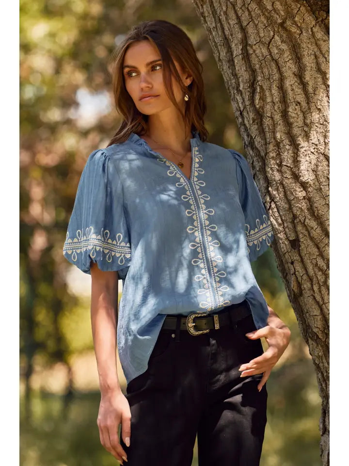 Elevate your everyday style with this charming bubble sleeve blouse! Featuring delicate embroidered details that add a touch of sophistication, this solid-colored piece strikes the perfect balance between polished and playful. The short bubble sleeves create a flattering, feminine silhouette that works beautifully for both casual outings and dressed-up occasions. Pair it with your favorite jeans, skirts, or trousers for endless styling possibilities. A wardrobe essential that brings personality and charm to any look.