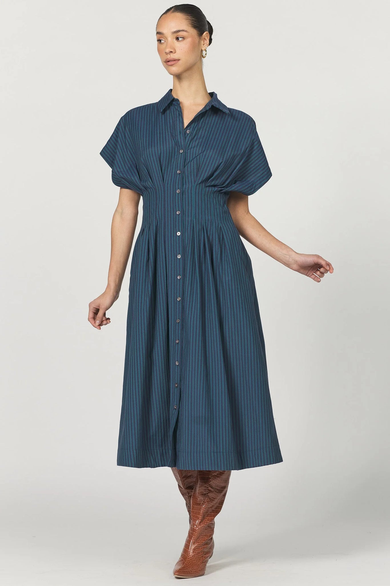 Plisse short sleeve button-up midi dress with a timeless collar design. Crafted from stripe woven, this piece provides comfort and sophistication for any occasion. It's a versatile staple simple yet elegant, it embodies a perfect blend of form and function for occasion.