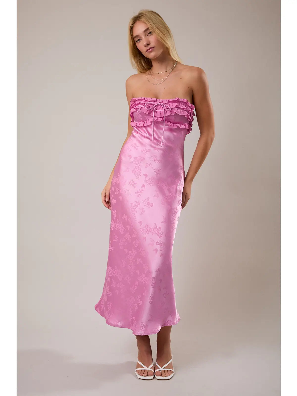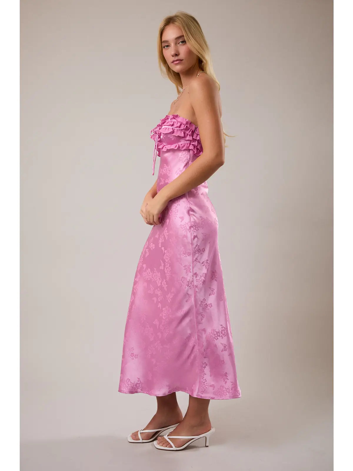 Twirl into spring with this adorable strapless ruffle midi dress! Featuring delicate butterfly details and romantic ruffled layers, it's the perfect pick for garden parties, brunch dates, or any occasion calling for effortless charm. The soft pink hue flatters every complexion, while the strapless neckline keeps things flirty and fun. Slip it on and let your style take flight.