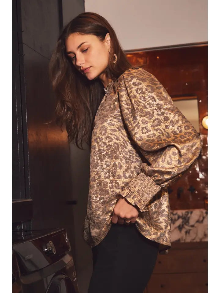 Make a statement with this eye-catching metallic leopard blouse that brings the wild side to your wardrobe. The shimmering animal print catches the light beautifully, while playful ruffled detailing at the neck adds instant charm. Long puff sleeves create a romantic silhouette, and smocked ruffle cuffs provide a fun finishing touch. Perfect for elevating casual looks or adding personality to your everyday style.