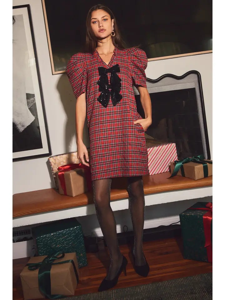 Step into the spotlight with this charming plaid mini shift dress, where classic pattern meets modern flair. The puffed sleeves add a touch of whimsy and dimension, while the eye-catching sequin bow tie at the front brings instant personality and sparkle. Perfect for parties, date nights, or whenever you want to turn heads, this dress combines vintage-inspired details with contemporary style. The relaxed shift silhouette ensures comfort without sacrificing sophistication, making it your go-to piece for standing out in the best way possible.