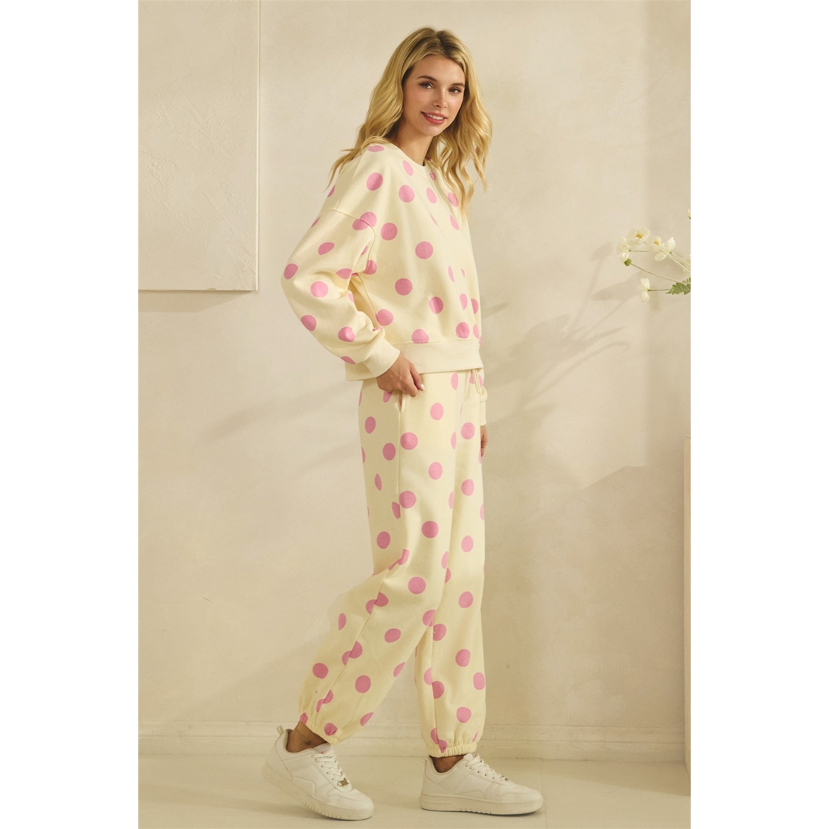 Cozy meets cute in this lightweight crewneck sweatshirt featuring an all-over polka dot pattern. The relaxed, oversized fit provides effortless comfort without the bulk, making it perfect for layering or wearing solo. Soft fabric drapes beautifully while staying breathable, ideal for casual days when you want to look put-together without trying too hard.