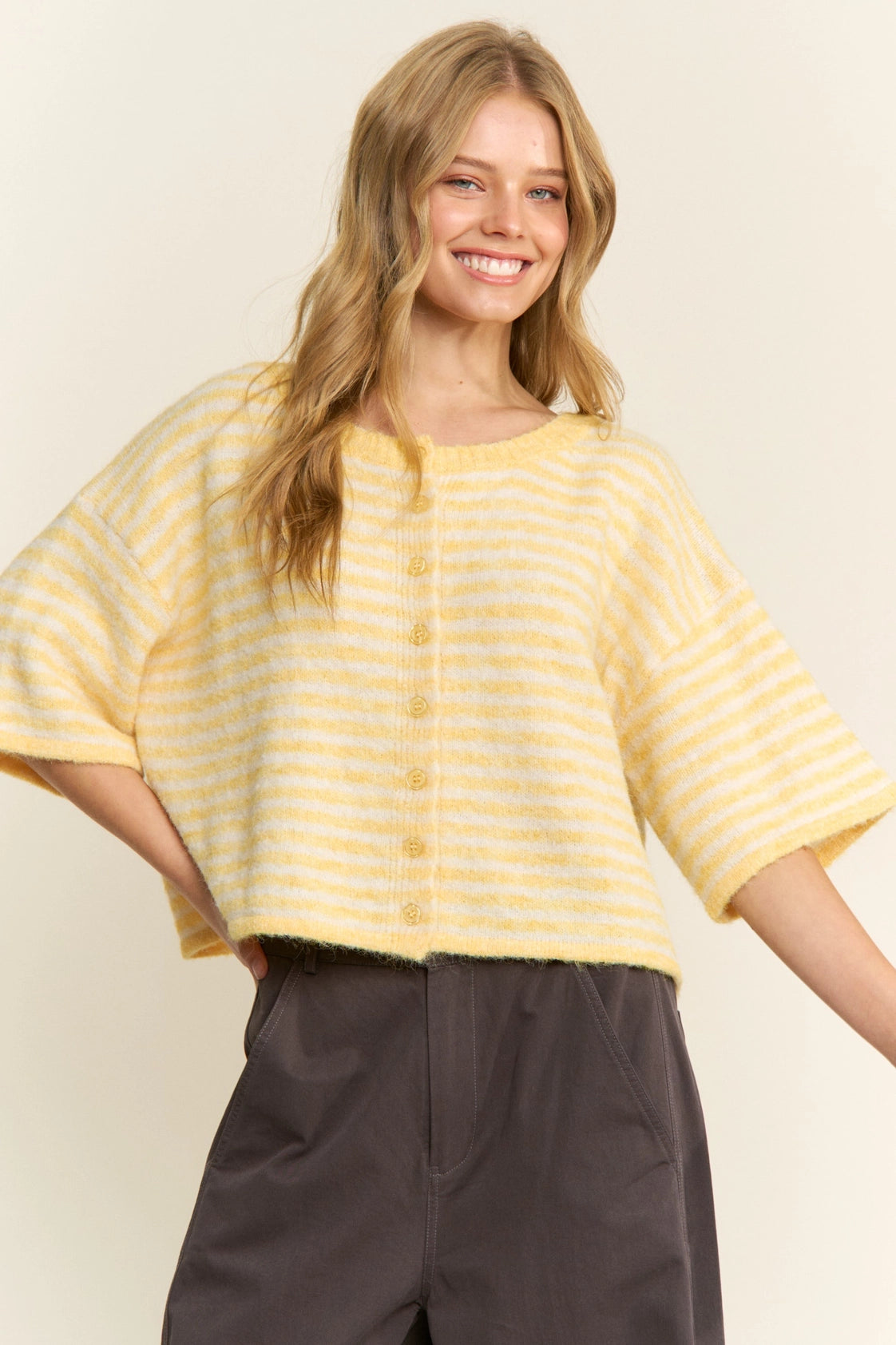 Effortlessly layer with this charming short sleeve knit cardigan. Crafted from soft, breathable fabric, it features classic stripes and a relaxed fit that works beautifully over tees or dresses. Perfect for transitional weather, this versatile piece adds warmth and style to any casual wardrobe. Button-front closure for easy styling.